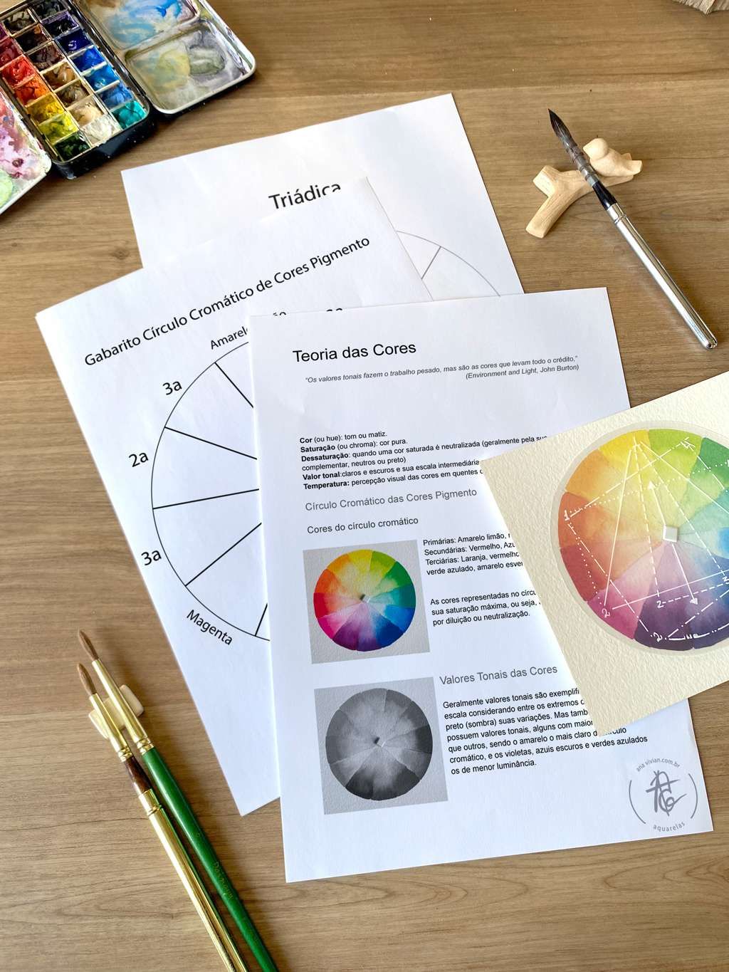 PDF para imprimir o risco do círculo, para que você aquarele seu próprio com as primárias, além da estrutura de todas as harmonias cromáticas para guiar sua escolha de cores que combinam quando utilizadas juntas, e guiar a criação de misturas de cores para criação de cores neutralizadas.